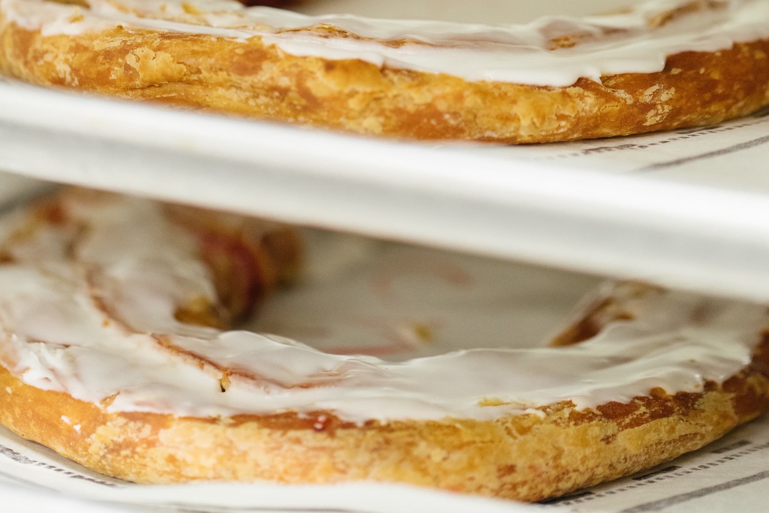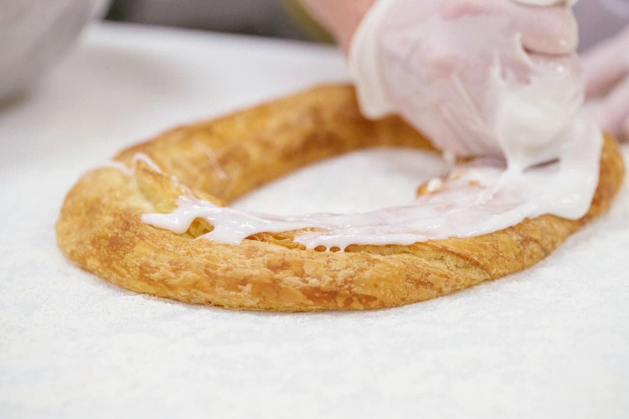 Once each filling is wrapped in our prepared dough, the kringles are placed in ovens where they will reach a golden brown status that is both beautiful and mouth-watering. We finish the process by hand-icing each kringle using care and consideration so you know you're getting a one-of-a-kind authentic Danish pastry.